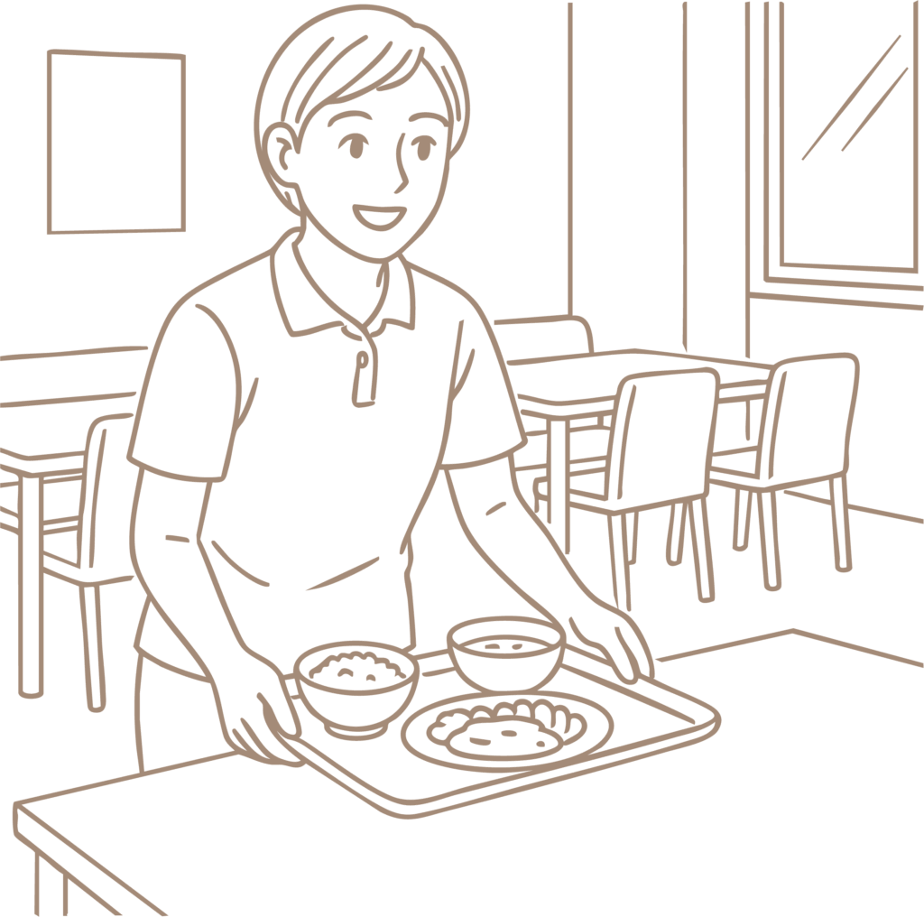 ・料理にトロミつける、おしぼり・エプロン配る